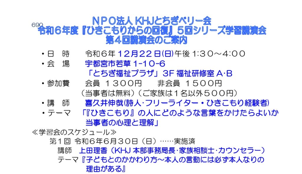 皆様、こんにちは。 本日、月例会ページと居場所ページを更新しました。 月例会•••令和7年1月開催、グループ相談会のチラシ掲載居場所•••活動内容と今後の予定を更新 更新内容は上記の通りです。 また、12月22日は学習講演会を開催致します。 詳細は、学習... -